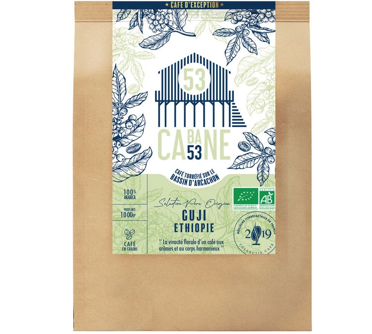DĂ©couvrez le cafĂ© en grains bio Guji de Cabane 53, un 100% Arabica d’Ethiopie. Un cafĂ© de spĂ©cialitĂ© torrĂ©fiĂ© par la meilleure torrĂ©factrice de France offrant une tasse avec une vivacitĂ© florale et un corps harmonieux. Conditionnement : 1kg.