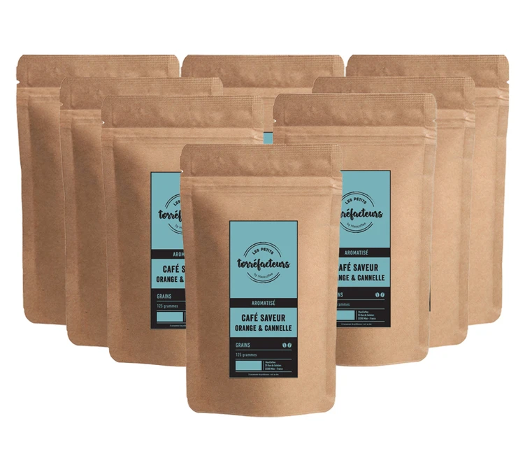 Dégustez ce café en grains aromatisé à l’orange et à la cannelle torréfié artisanalement en France par une équipe d’artisans torréfacteurs passionnés. Aromatisation artificielle. Conditionnement : 8×125 grammes en sachet kraft.