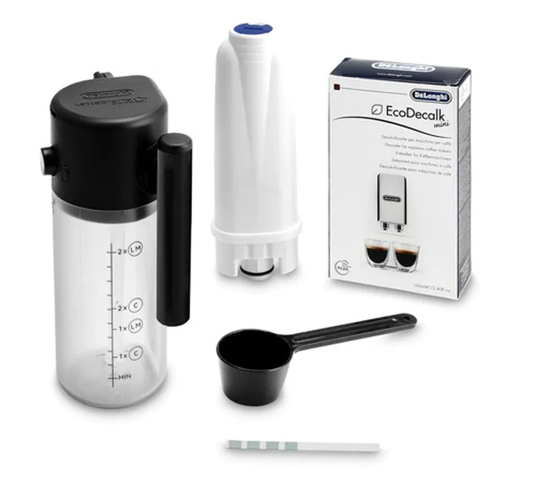 N’hĂ©sitez pas Ă consulter notre article au sujet de l’entretien des expressos broyeurs DeLonghi. Vous pouvez aussi retrouver nos produits d’entretien DeLonghi. L’ensemble prĂ©sent sur la photo est livrĂ© avec la machine (carafe Ă lait, cartouche filtrante, dĂ©tartrant liquide, cuillère doseuse et bande de duretĂ© de l’eau).
