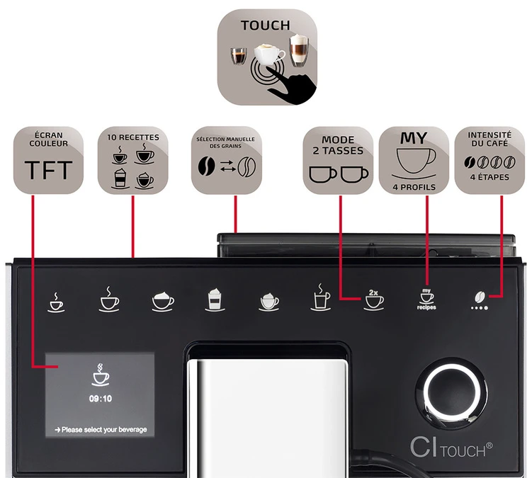 Caffeo® Ci-Touch Noire dispose d’un avantage : Elle est Ă©quipĂ©e d’une double bac Ă grains ! De plus, elle affiche toutes les fonctions haut de gamme de Melitta : MĂ©moire My Coffee pour mĂ©moriser vos spĂ©cialitĂ©s de cafĂ© favorites, fonction OneTouch pour de parfaits cappuccinos, en mode 2 tasses simultanĂ©ment . Elle bĂ©nĂ©ficie, exclusivement chez MaxiCoffee, d’une garantie de 3 ans totalement gratuite (coĂ»t moyen relevĂ© sur d’autres sites : 80€).
